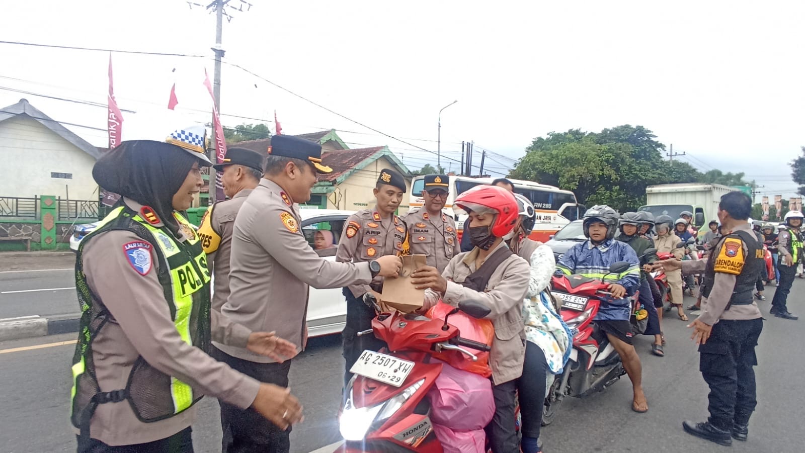 Di sela-sela pengaturan arus lalu lintas, Kapolres Jombang juga menyempatkan diri untuk berbagi dengan para pemudik yang melewati jalur arteri Bandar Kedungmulyo. Beliau secara langsung membagikan bingkisan kepada pemudik sebagai bentuk kepedulian dan dukungan terhadap para pelaku perjalanan yang sedang menuju kampung halaman.