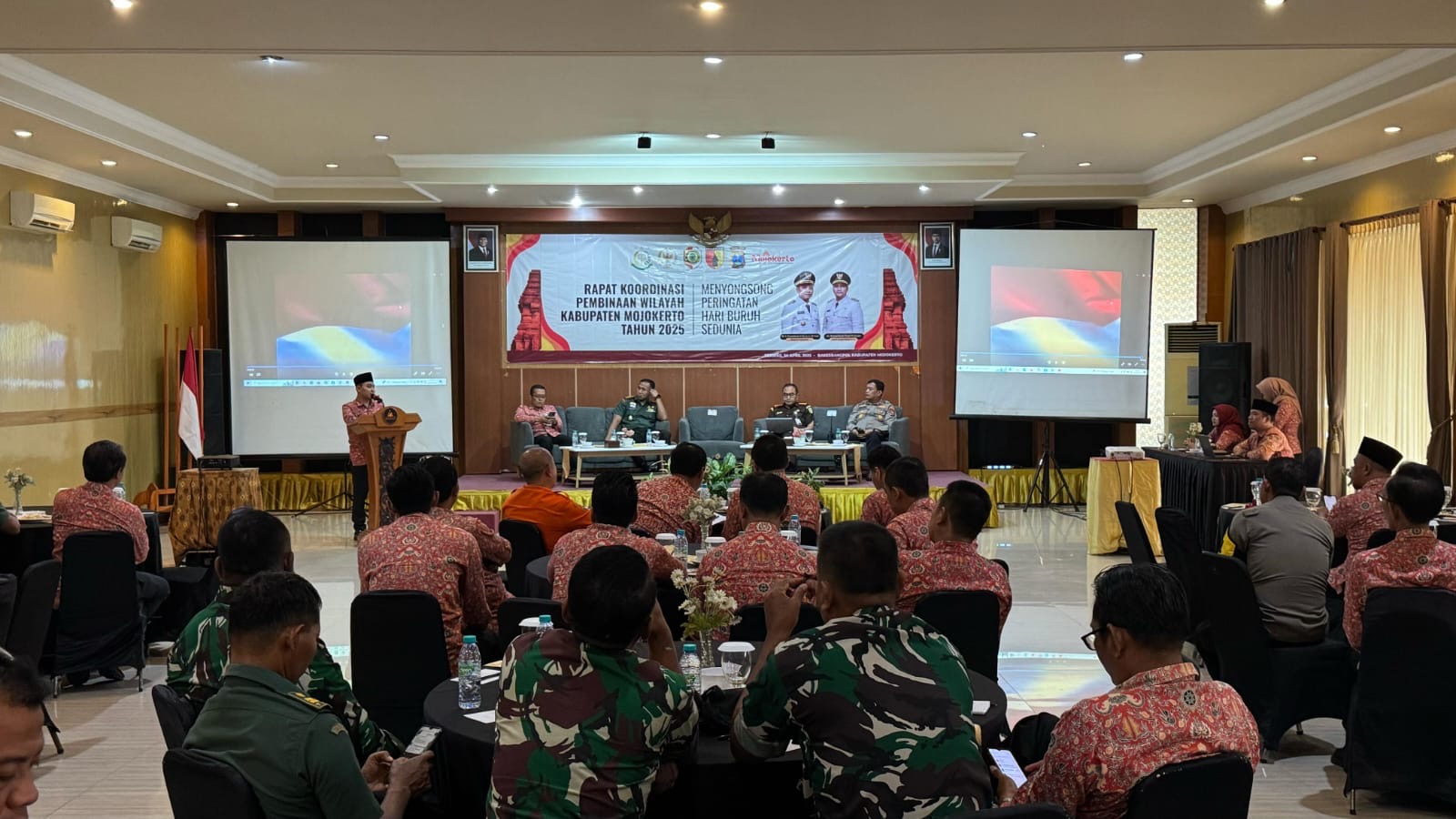 Kabupaten Mojokerto – suaraharianjatim.com : Menjelang peringatan Hari Buruh Internasional atau May Day pada 1 Mei 2025, Pemerintah Kabupaten Mojokerto menggelar rapat koordinasi pembinaan wilayah, Kamis (24/4), bertempat di Aula Arayanna Hotel & Resort, Trawas. Kegiatan ini dihadiri oleh jajaran Forkopimda, Forkopimca dari 18 kecamatan, serta sejumlah tokoh strategis di daerah.