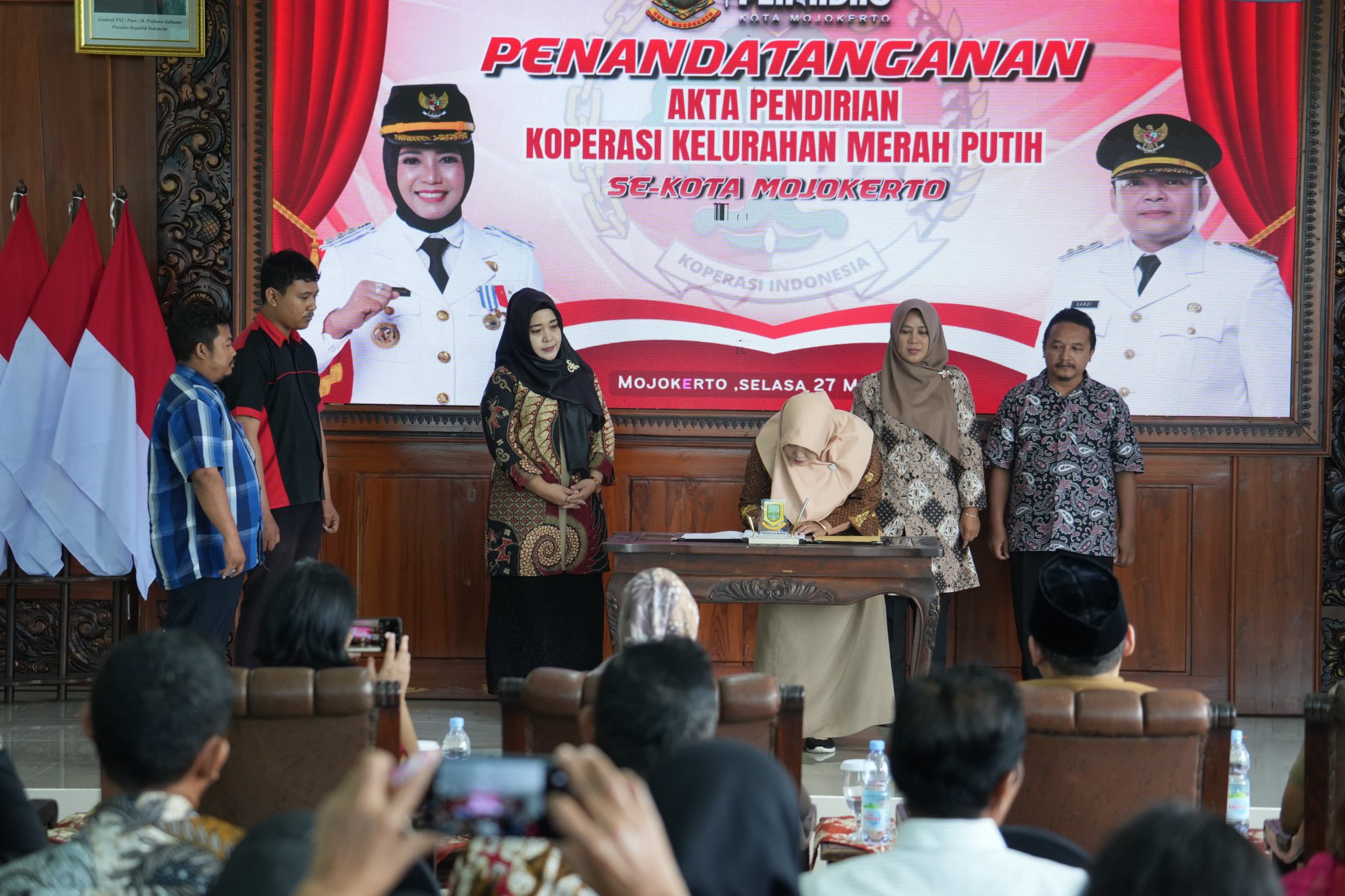 Kota Mojokerto — suaraharianjatim.com : Sebanyak 18 koperasi kelurahan dan 1 koperasi pasar di Kota Mojokerto resmi menandatangani akta notaris pendirian Koperasi Merah Putih secara serentak, dalam sebuah seremoni yang digelar di PLUT Maja Citra Kinarya, Selasa (27/5).