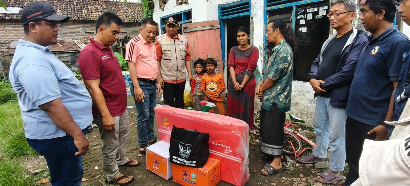 Mewakili Bupati Jombang, Sekretaris Daerah Kabupaten Jombang, Agus Purnomo, S.H., M.Si, didampingi oleh Plt Kepala Pelaksana BPBD Jombang, Wiku Bhirawa, serta perwakilan dari Dinas Sosial, Forkopimcam setempat, menyalurkan bantuan kepada pemilik rumah.