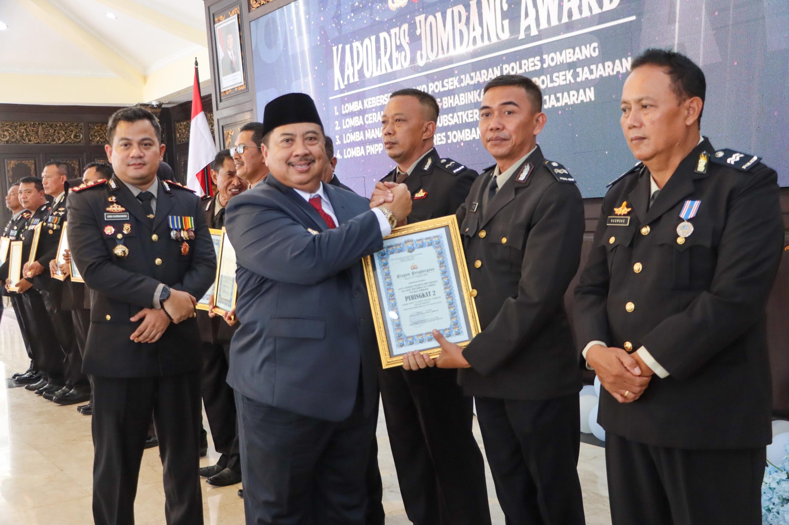 Kapolres Jombang juga menyerahkan penghargaan kepada Bupati Jombang, Abah Warsubi, S.H., M.Si., dan Dandim 0814 Jombang, Letkol Kav Dicky Prasojo, S.H., M.Han, atas dukungan dan kontribusi mereka dalam membantu tugas-tugas kepolisian dalam menjaga keamanan dan ketertiban masyarakat di wilayah Jombang.