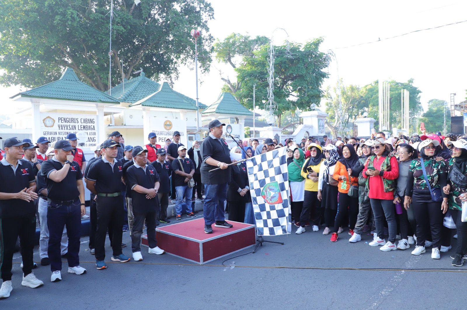 Bupati Jombang, H. Warsubi, didampingi H Salmanudin Yazid, Wakil Bupati Jombang dan bersama jajaran Forkopimda hadir dan melepas langsung peserta jalan sehat dari panggung utama.