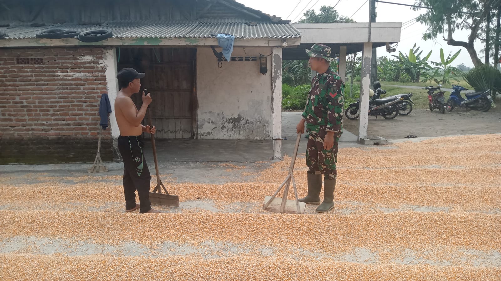 Jombangsuaraharianjatim.com : Kegiatan penanganan pasca panen jagung yaitu pengeringan dengan metode dijemur ataupun dioven, karena kegiatan pengeringan sangat perlu dilakukan dengan baik dan benar untuk menjaga kualitas jagung sebelum dijual.Kali ini Koptu Widodo Anggota Koramil 0814-12/ Kesamben menyempatkan mengunjungi warga yang sedang menjemur jagung.Disela sela kesibukannya dalam kegiatan TMMD Koptu Widodo menyempatkan diri membantu Bapak Harno menjemur jagung.Bertempat di dusun Gondang Desa Kromong Kecamatan Ngusikan.Senin (04/08/2025).