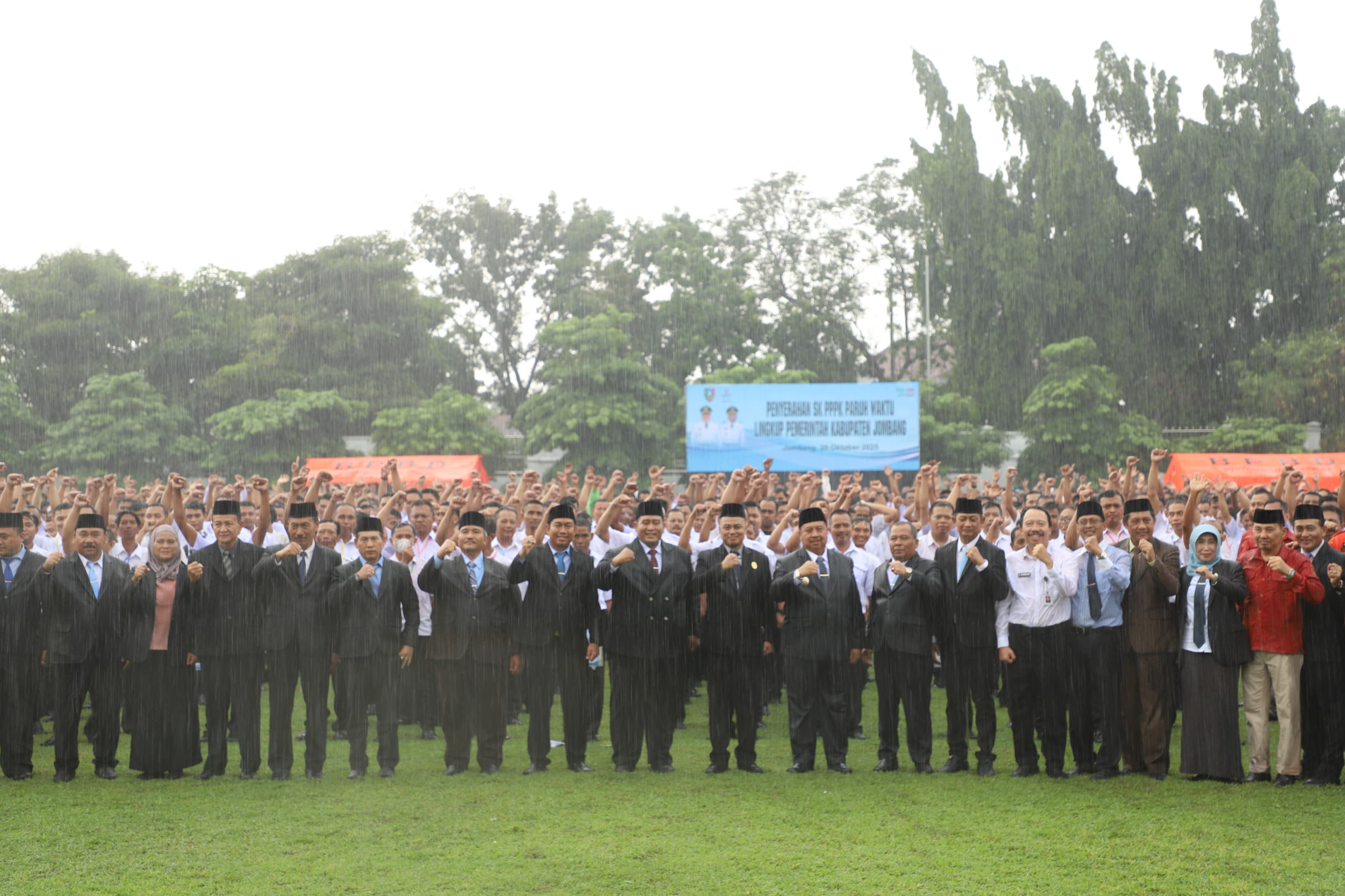 Jombang – suaraharianjatim.com : Ribuan wajah haru tak lagi memikirkan dinginnya guyuran hujan deras pada Selasa (28/10) siang di Lapangan Pemkab Jombang. Sebanyak 4.101 pegawai non-ASN akhirnya menuntaskan penantian panjang mereka, resmi menerima Surat Keputusan (SK) pengangkatan sebagai Pegawai Pemerintah dengan Perjanjian Kerja (PPPK) Paruh Waktu.