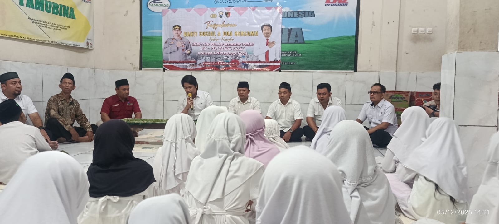 Mojokerto Kota – suaraharianjatim.com : Dalam rangka memperingati Hari Jadi Fungsi Reserse Polri ke-78, Satuan Reserse Kriminal (Satreskrim) Polres Mojokerto Kota melaksanakan kegiatan bakti sosial dan doa bersama di Yayasan Yamubina Lingkungan Kedungsari Gang IV RT 001 RW 002 Kelurahan Gunung Gedangan, Kecamatan Magersari, Kota Mojokerto, Jumat (5/12).