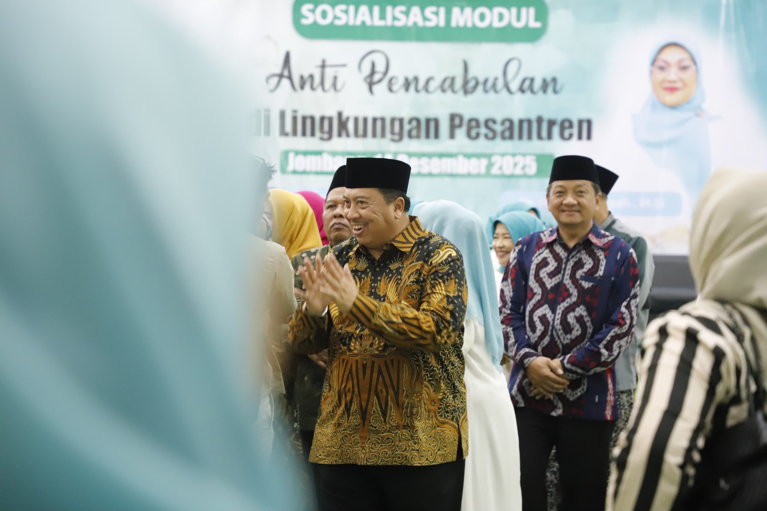 Jombang – suaraharianjatim.com : Bupati Jombang, Warsubi SH., M.Si, menegaskan bahwa upaya perlindungan anak dan pencegahan kekerasan seksual di lingkungan pendidikan adalah tanggung jawab kolektif. Penegasan ini disampaikan Warsubi Bupati Jombang saat hadir dan memberikan sambutan pada acara Sosialisasi Modul Anti Pencabulan di Lingkungan Pesantren yang diselenggarakan oleh Pengurus Pusat Harakah Majelis Taklim (PP HMT) di Pondok Pesantren Mambaul Ma’arif, Denanyar pada Minggu (14/12/2025).