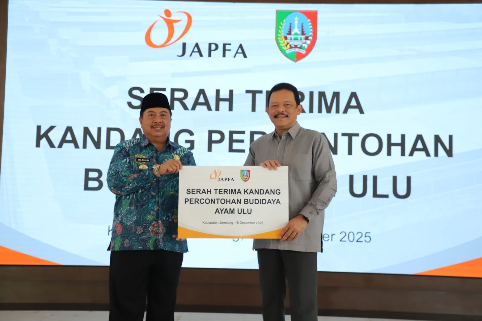 Jombangsuaraharianjatim.com : Langkah besar diambil Pemerintah Kabupaten Jombang dalam memperkuat ketahanan pangan dan ekonomi kerakyatan. Bertempat di Pendopo Kabupaten Jombang, Kamis (18/12/2025) PT Japfa Comfeed Indonesia Tbk (JAPFA) secara resmi menyerahkan aset Corporate Social Responsibility (CSR) berupa kandang ayam percontohan kepada Pemerintah Kabupaten Jombang. Kandang yang berlokasi di Puskeswan Diwek, Desa Keras Kecamatan Diwek diproyeksikan menjadi pilot project pengembangan Ayam ULU, (Unggas Lestari Unggul) ayam lokal unggulan yang diharapkan mampu menjadi motor penggerak ekonomi bagi peternak lokal.
