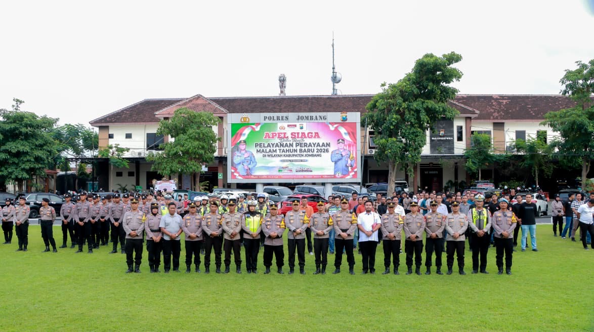 Jombang – suaraharianjatim.com : Ratusan personel Polres Jombang disiagakan dalam rangka Pelayanan Pengamanan Malam Tahun Baru 2026, guna memastikan situasi keamanan dan ketertiban masyarakat tetap aman dan kondusif. Kesiapan tersebut ditandai dengan pelaksanaan Apel Pelayanan Pengamanan yang dipimpin langsung oleh Kapolres Jombang, AKBP Ardi Kurniawan, S.H., S.I.K., CPHR, dan diikuti oleh personel Polres Jombang serta Polsek jajaran yang terlibat dalam pengamanan perayaan pergantian tahun di wilayah Kabupaten Jombang.