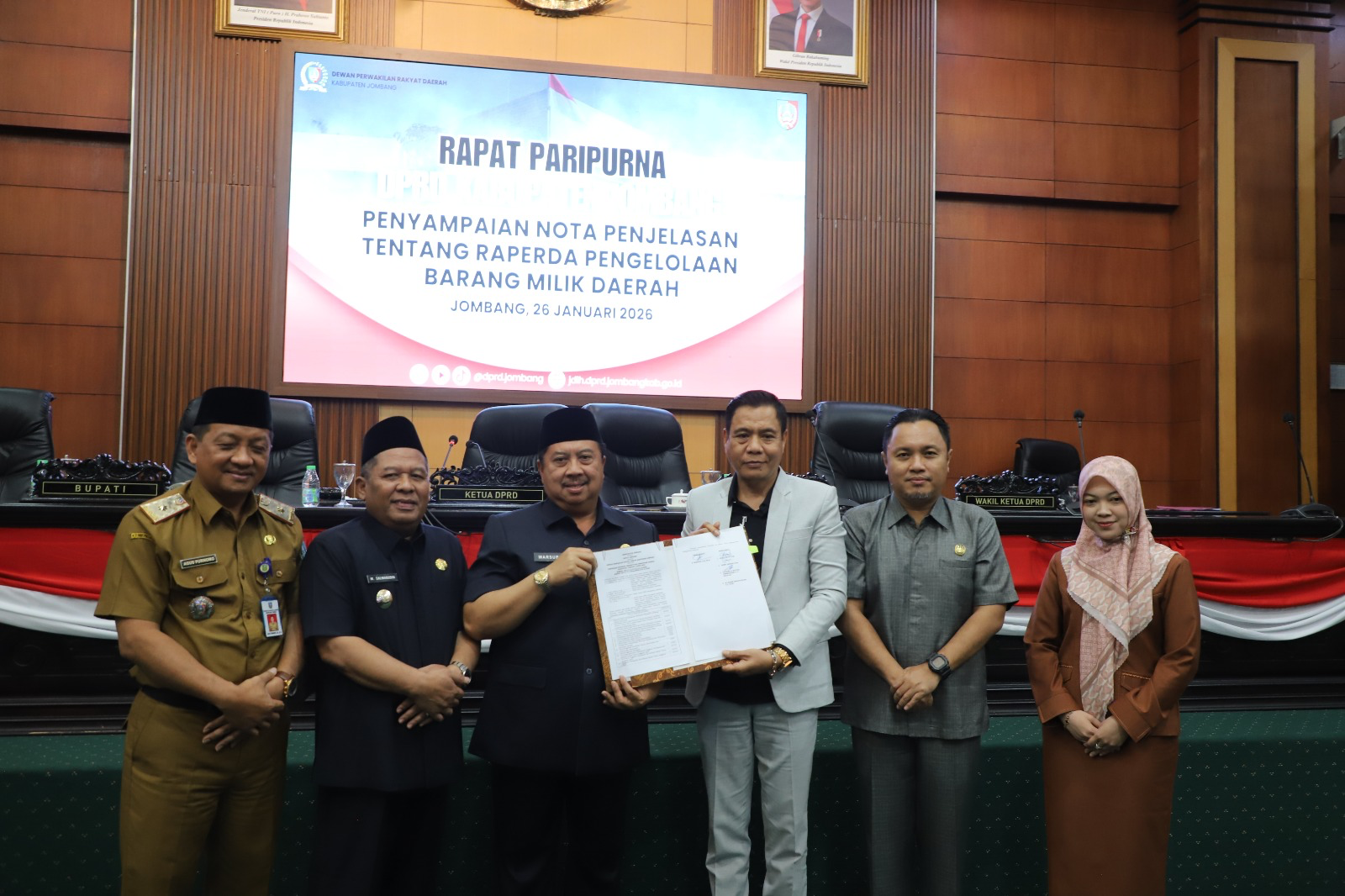Rapat Paripurna dengan agenda Penyampaian Nota Penjelasan tentang Raperda Pengelolaan Barang Milik Daerah, diakhiri dengan penandatanganan Penetapan Perubahan Program Pembentukan Peraturan Daerah (Propemperda) Tahun 2026 tersebut dipimpin oleh Hadi Atmaji, S.Ag Ketua DPRD Jombang didampingi para Wakil Ketua, dihadiri oleh Wakil Bupati Jombang Salmanudin, S.Ag, M.Pd, jajaran perwakilan Forkopimda, Sekretaris Daerah, Agus Purnomo, S.H., M.Si, para Kepala OPD, hingga Direktur BUMD di lingkungan Pemerintah Kabupaten Jombang.*red