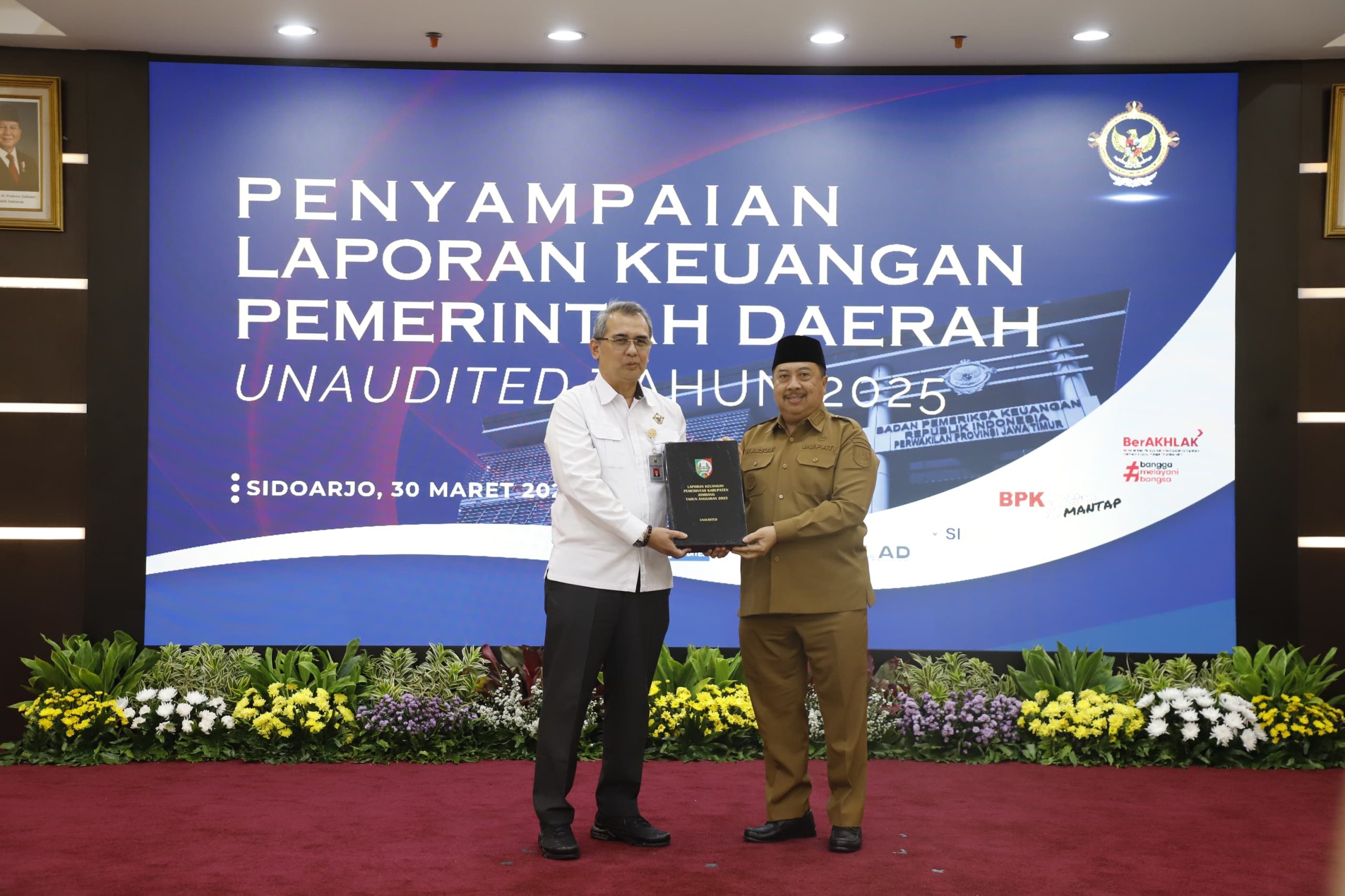 Jombang – suaraharianjatim.com : Bupati Jombang, Warsubi, S.H., M.Si telah menyerahkan Laporan Keuangan Pemerintah Daerah (LKPD) Unaudited Tahun Anggaran 2025 kepada Badan Pemeriksa Keuangan (BPK) Perwakilan Provinsi Jawa Timur di Sidoarjo, Senin (30/3/2026) siang.