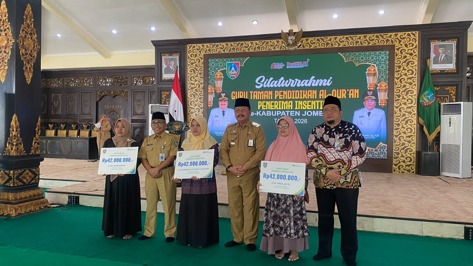 Pada momentum tersebut juga diserahkan santunan program jaminan kematian dari BPJS Ketenagakerjaan kepada 3 ahli waris guru TPQ masing-masing senilai Rp. 42.000.000 (Empat Puluh Dua Juta Rupiah).